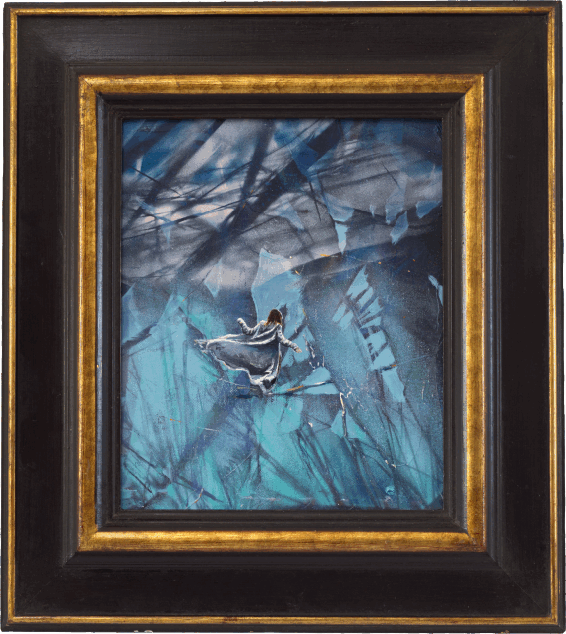 An important part of the exhibition also consists of several small-format paintings, framed in antique frames found over the years at flea markets and secondhand shops. No frame was chosen at random; each frame bears traces of its previous life and brings with it its own narrative layer. The artist has chosen not to restore these frames. Cracks in the gold, worn ornaments, dust in the corners – all of this remains visible and becomes an integral part of the works.