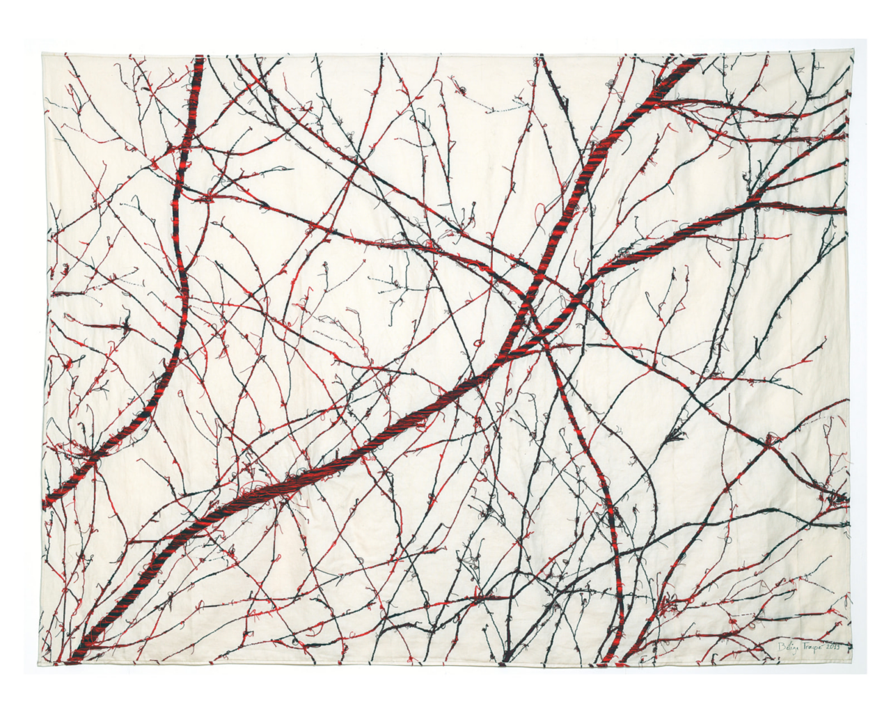 The artist began this artwork in her native Guadeloupe, then continued working on it during a stay in Bandjoun (Cameroon) and finished it back in her studio. The tapestry, which is more than 2 meters long, thus becomes a metaphor for a journey that shaped the artist like many other people. It shows the roots of an Atlantic identity that is not simply African, American or European, but was created over centuries through the brutally enforced trade between these areas across the “Black Atlantic”.