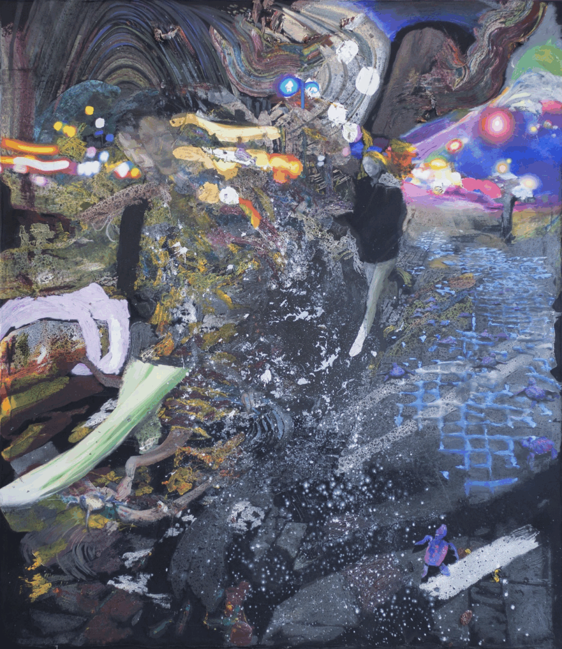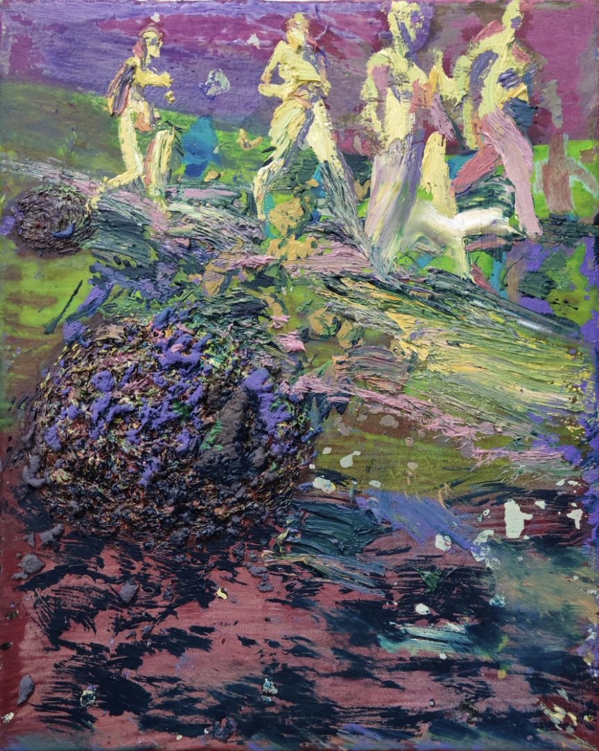 Guiseppe Gonella’s paintings reflect on modern human rituals, dreams, and fears. They do so through dystopian and mysterious landscapes. These landscapes blend memory with modern allegory. His expressive brushwork and fragmented narratives invite viewers into emotionally charged, dreamlike worlds where time and space collapse.