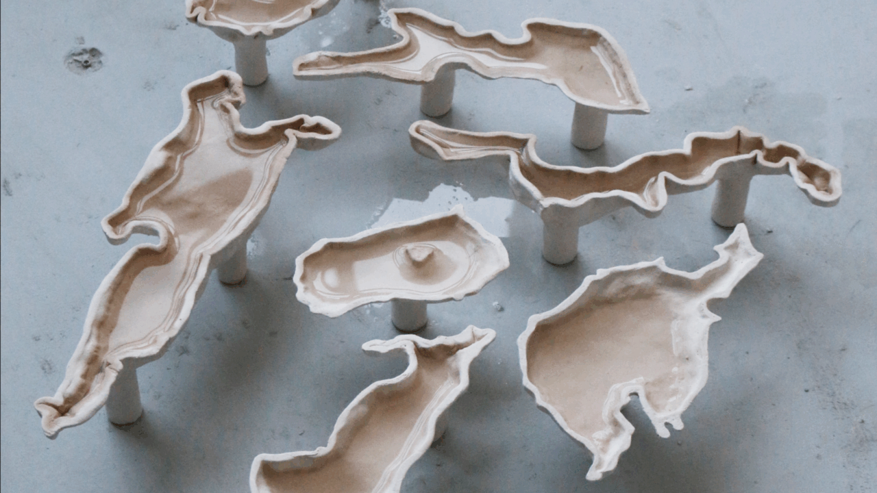 Marie Salcedo Horn, Paulina Schute, It‘s like water everywhere, Multimediale Installation aus Keramik, Metall, Sound, 2025