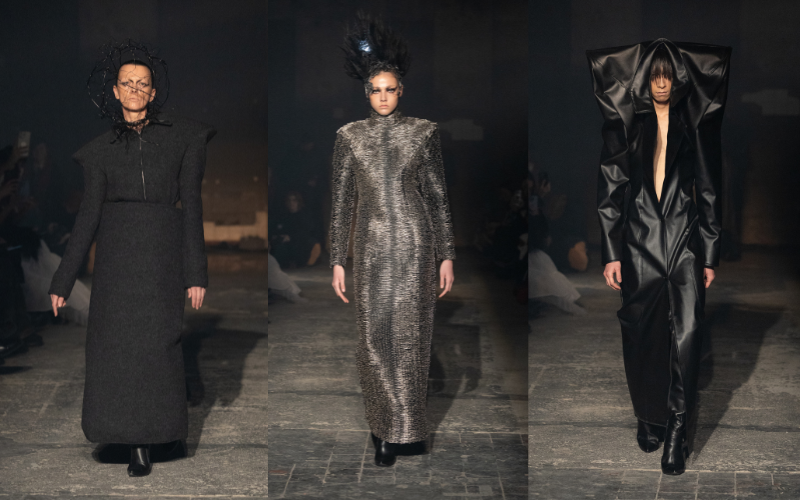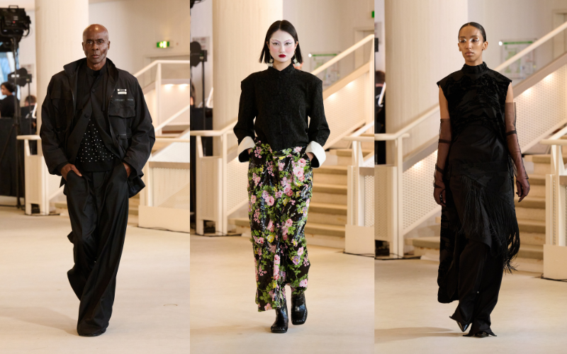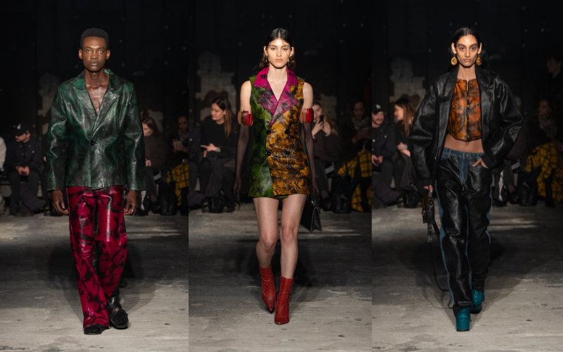 Standout pieces included a sleeveless blazer mini dress, perfectly tailored blazers, and mixed-material trousers, each made half from leather and half from deadstock denim. A color palette of warm brown and yellow tones, combined with bold green, pink, and black, reflected the designer’s emotions and experiences – turning the collection into a visual mood board of his life. Read more…