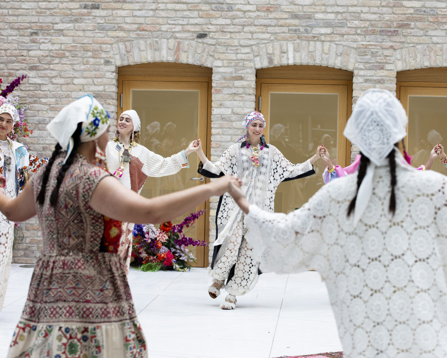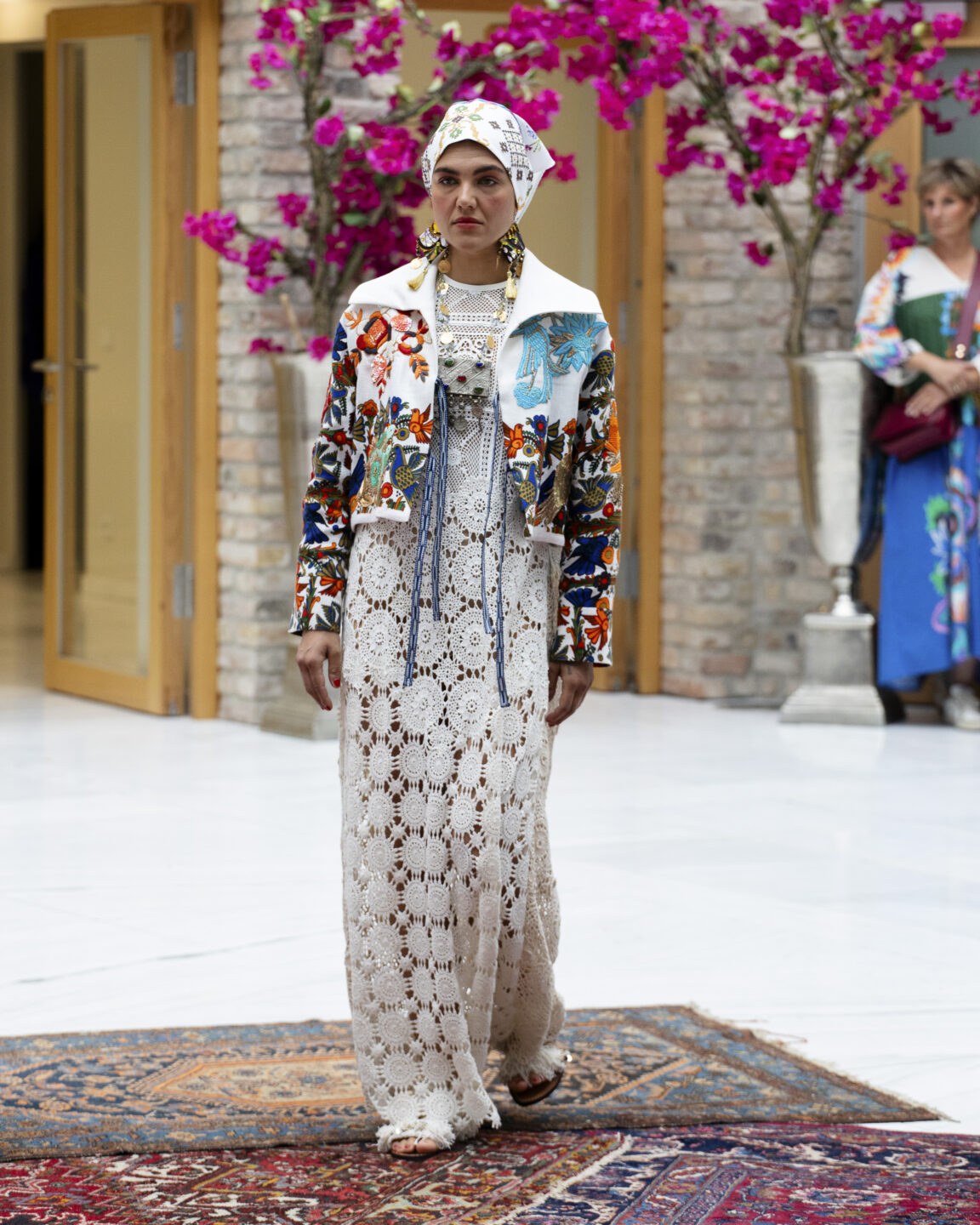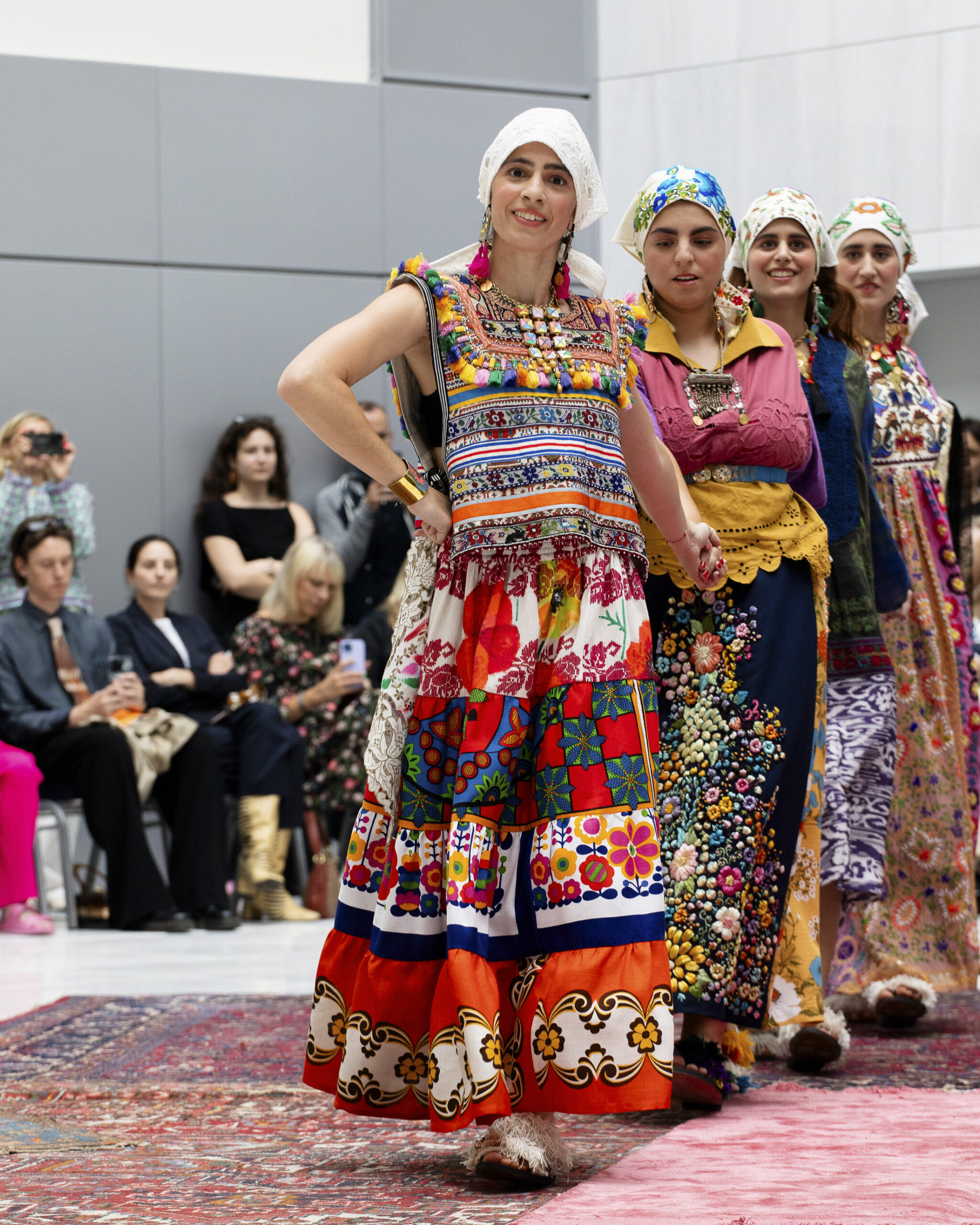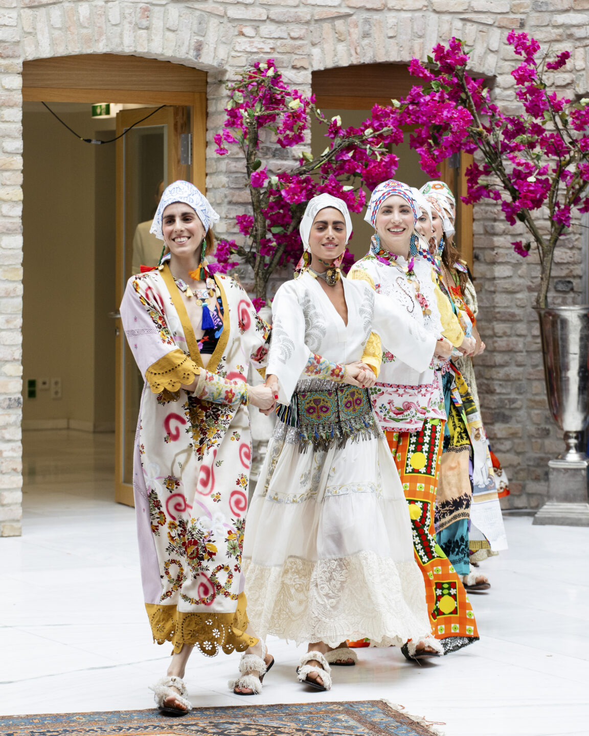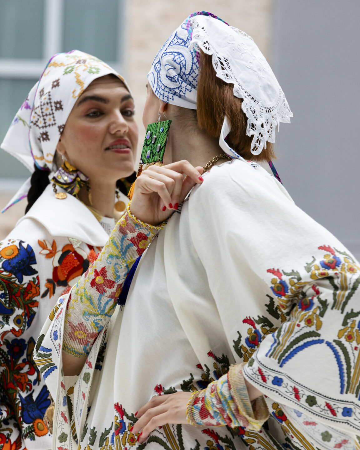 We believe all of our pieces will highlight the show! But if we have to name a few: There is a dress composed of Greek tablecloths combined with a traditional embroidery piece from the Balkan region. Another highlight is a traditional Greek Manteau made of different kitchen towels sewn together. Lastly, we have a skirt and blouse outfit that exudes Greek tradition. The blouse is made of five different dyed tablecloths, creating an airy, colorful finish. The skirt is composed of two panels: the back panel is a piece of a printed Greek tablecloth with little flowers printed on it, and the front consists of a panel embroidered with straw, continuing the theme of flowers throughout the outfit.