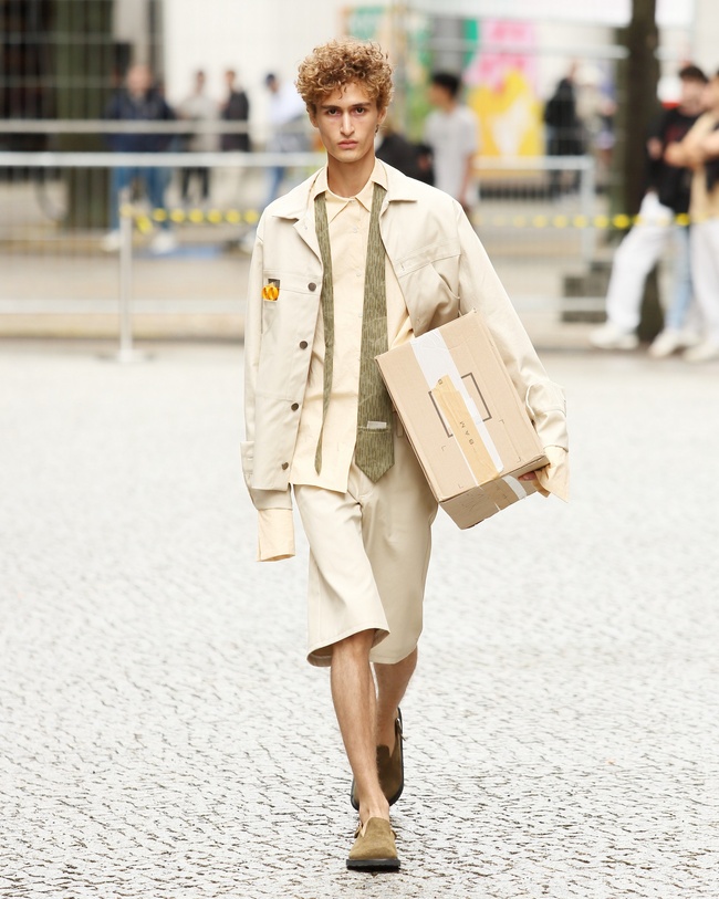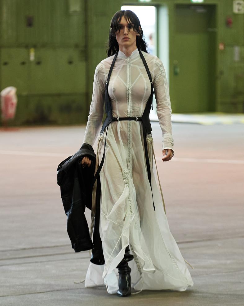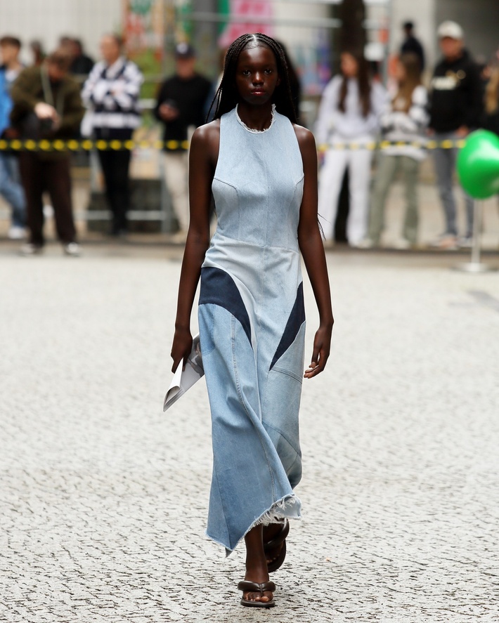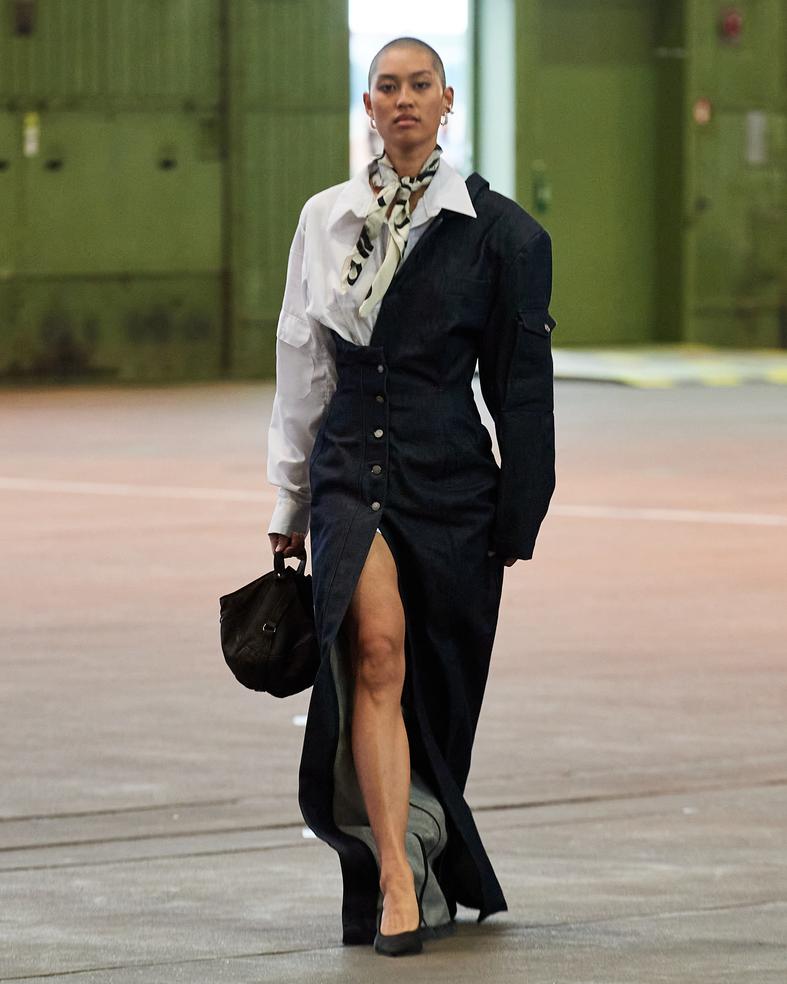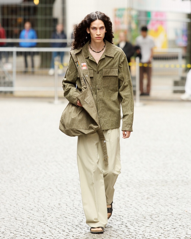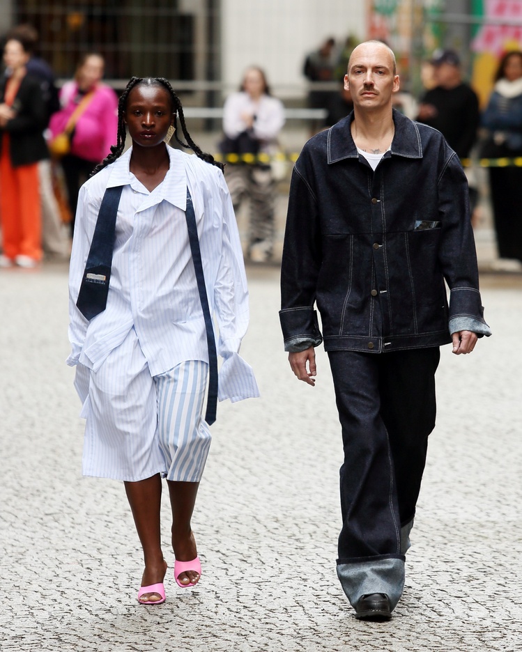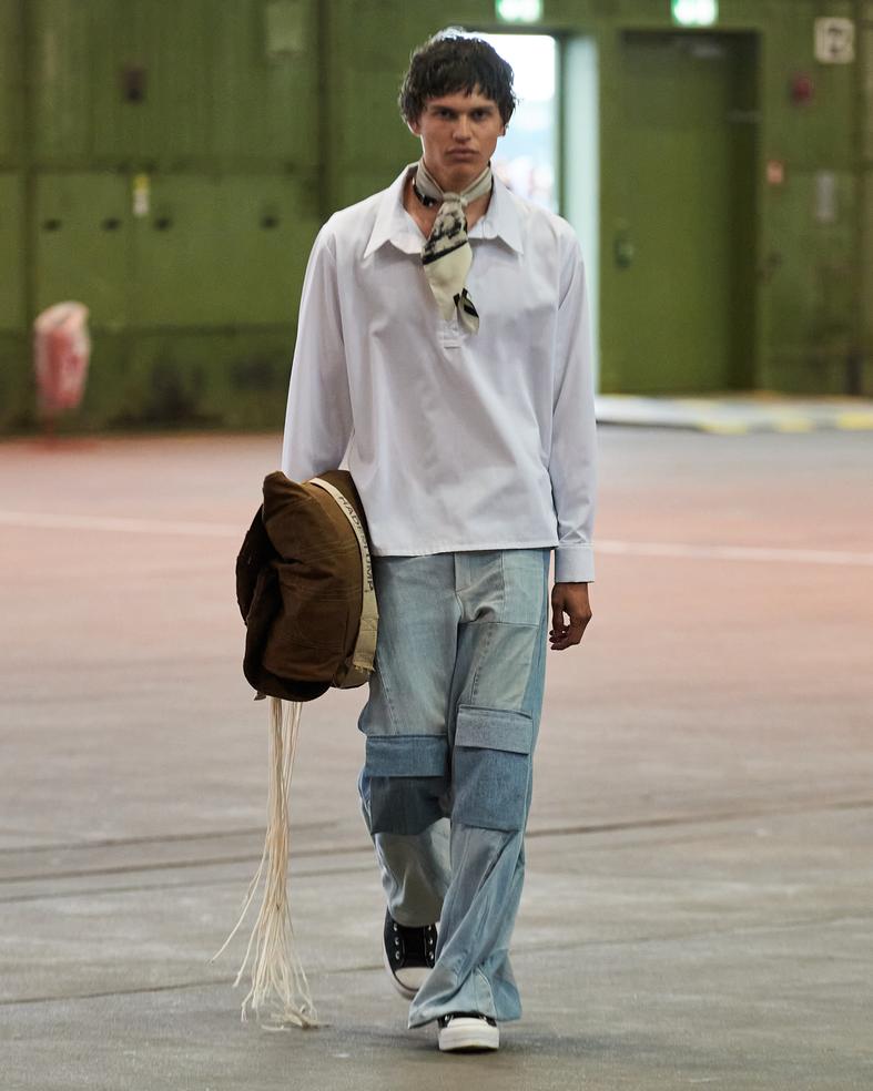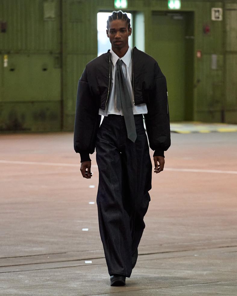 Berlin Contemporary winner Julius Weissenborn showcased his Haderlump collection before a large audience against the backdrop of historic aircraft in the impressive Hangar 6 of Tempelhof Airport. Featuring bomber jackets made from recycled parachute fabrics, leather caps, coats with fluttering satin inserts, and uniform-like denim looks, “AERO” reflected the pioneering spirit of early 20th-century aviators.