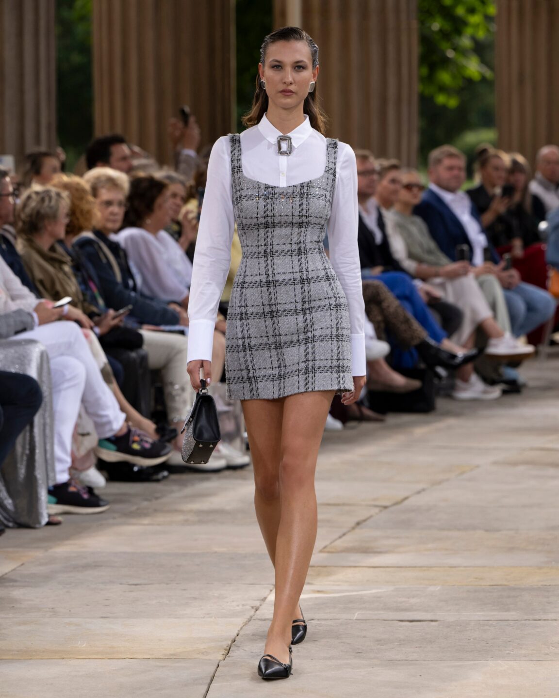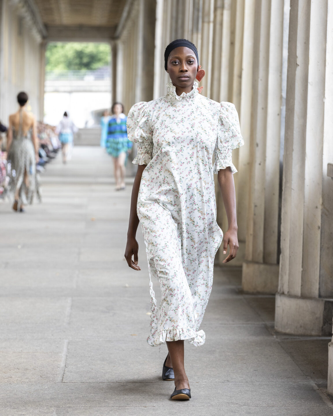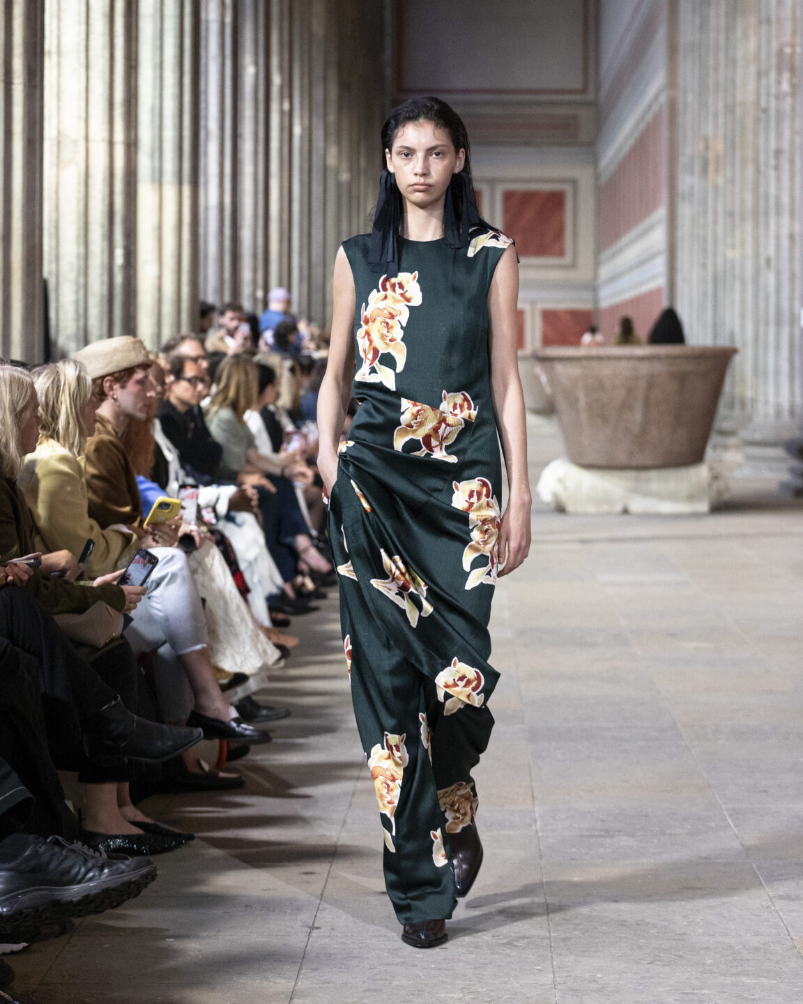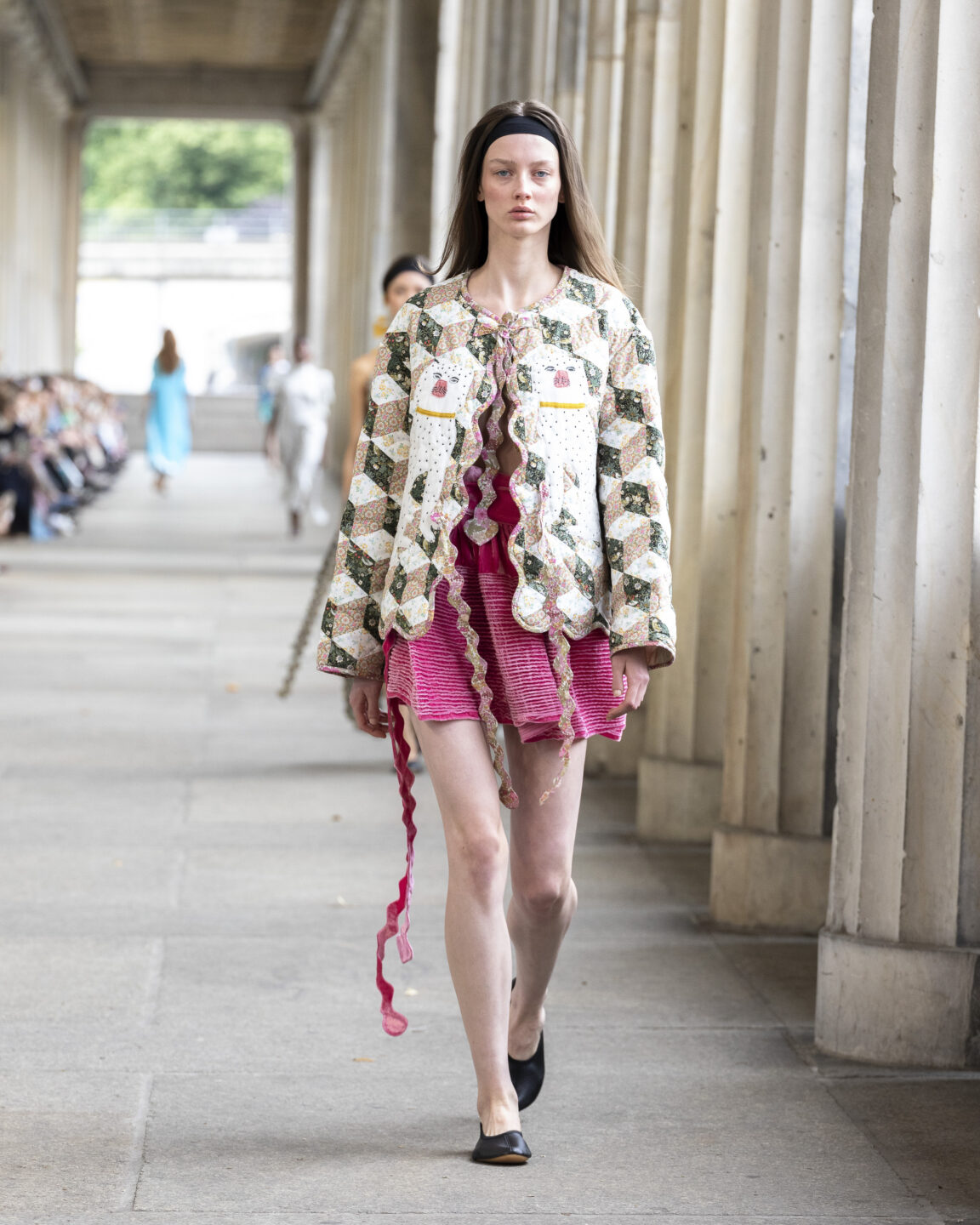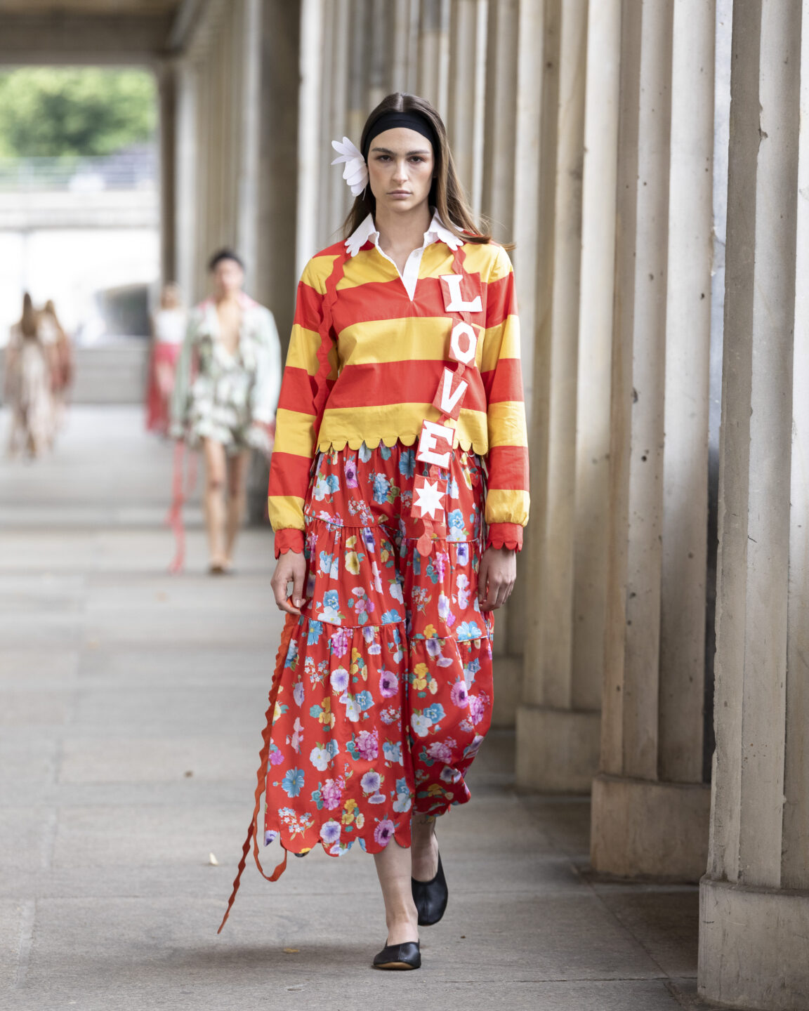 With her runway debut, the Berlin Contemporary winner also celebrates the tenth anniversary of her brand. Heinrichs chose the colonnade at the Museum Island as the runway, whose numerous columns symbolize for the designer the enduring power of love-a central theme in her collection.