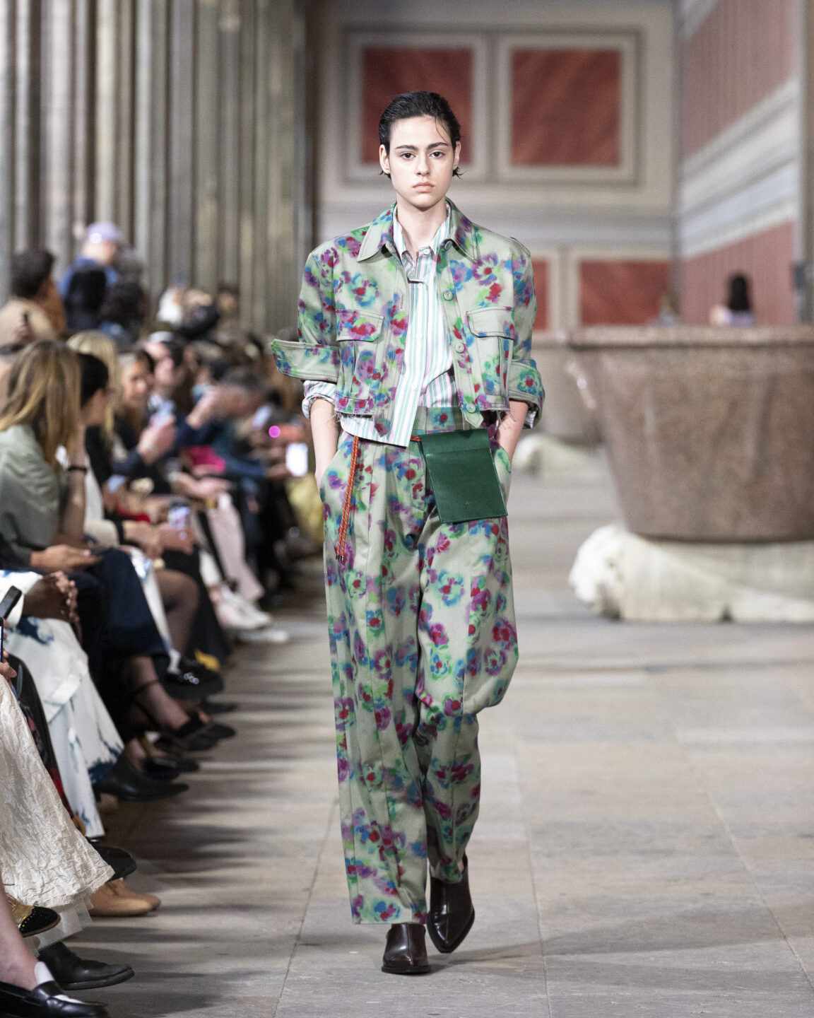 Athletic track pants combined with mini blazers, techno fabrics, and abstract, Japanese-inspired floral prints were on display. Classic striped shirts were refined with small rhinestones, while the shimmering threads of two acid-green looks fluttered charmingly in the wind. Particularly chic were the light pink designs with raw edges, adorned with sparkling brooches.