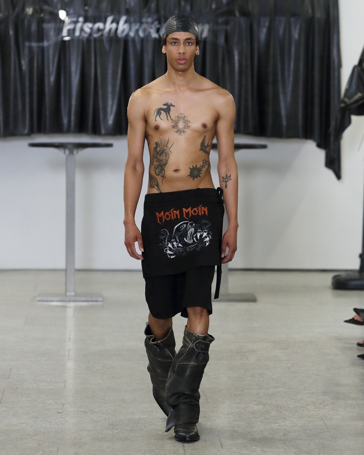 Their inspiration is reflected in the range of designs, from airy silhouettes like water-repellent checkered ensembles and dresses with the inscription “Moin Moin,” which convey a sense of freedom, to tailored pieces such as a long black neoprene coat and crop tops with air cushions that symbolize comfort and protection.