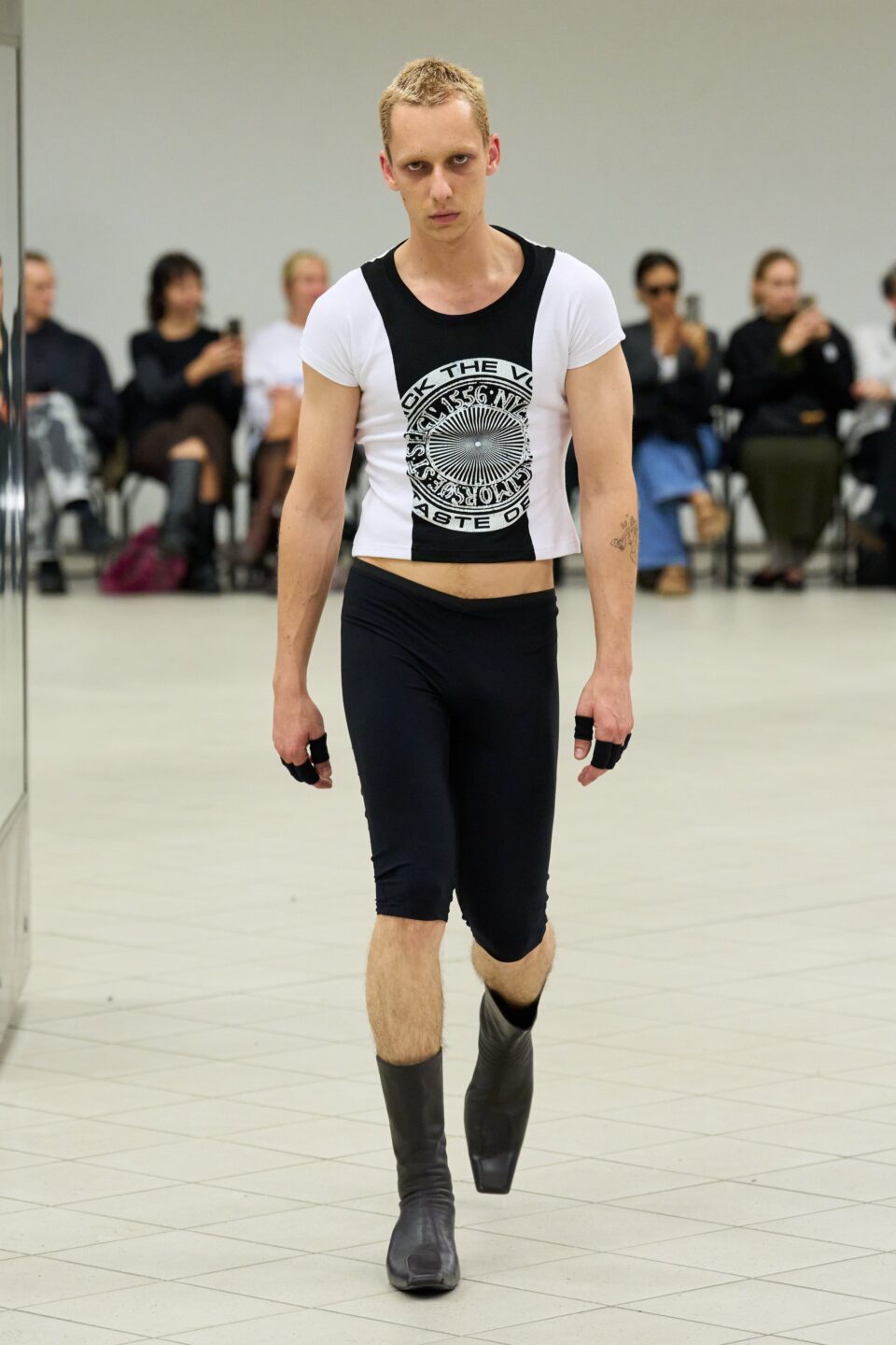The focus of the numerous sporty outfits was the polo shirt, which Arnika presented in various versions: sometimes as a super-tight halter neck, then layered, reminiscent of an XXL basketball jersey, or with delicate ruffle inlays and partially printed with the phrase “The People Want More.”