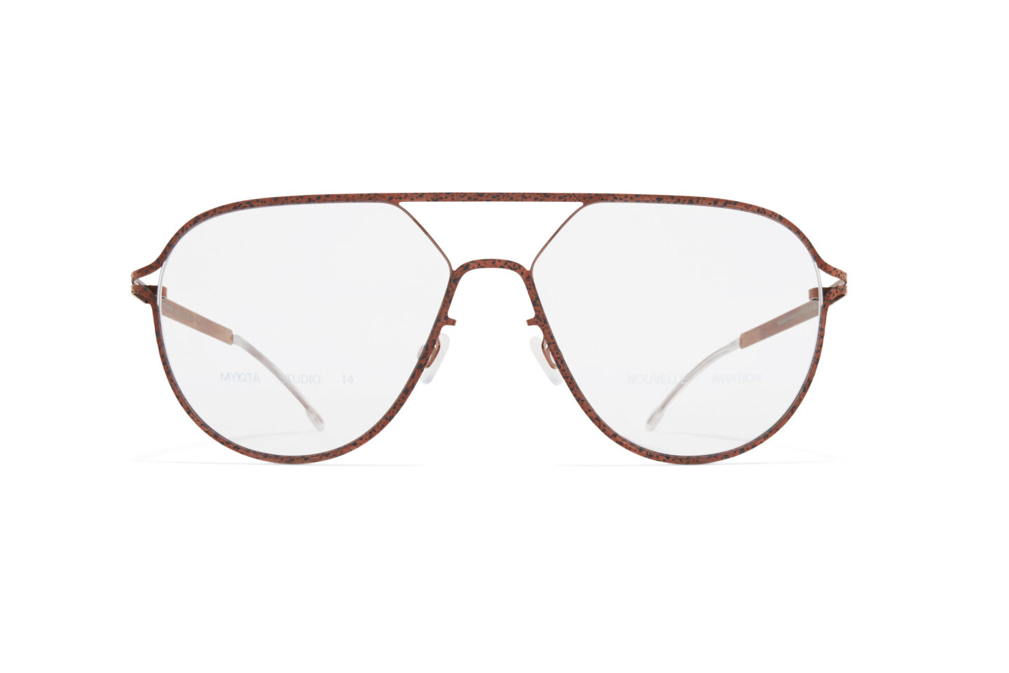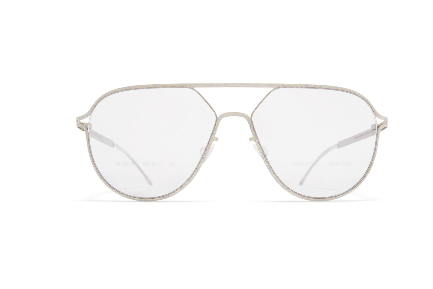The frame is a fresh take on the aviator silhouette offering flowing lines and a terrazzo surface pattern. Signature stainless steel artistry from the MYKITA HAUS – STUDIO 14 is a capsule collection of airy and lightweight optical frames. Side pieces with rounded edges give a subtle nod to aerodynamic aesthetics.