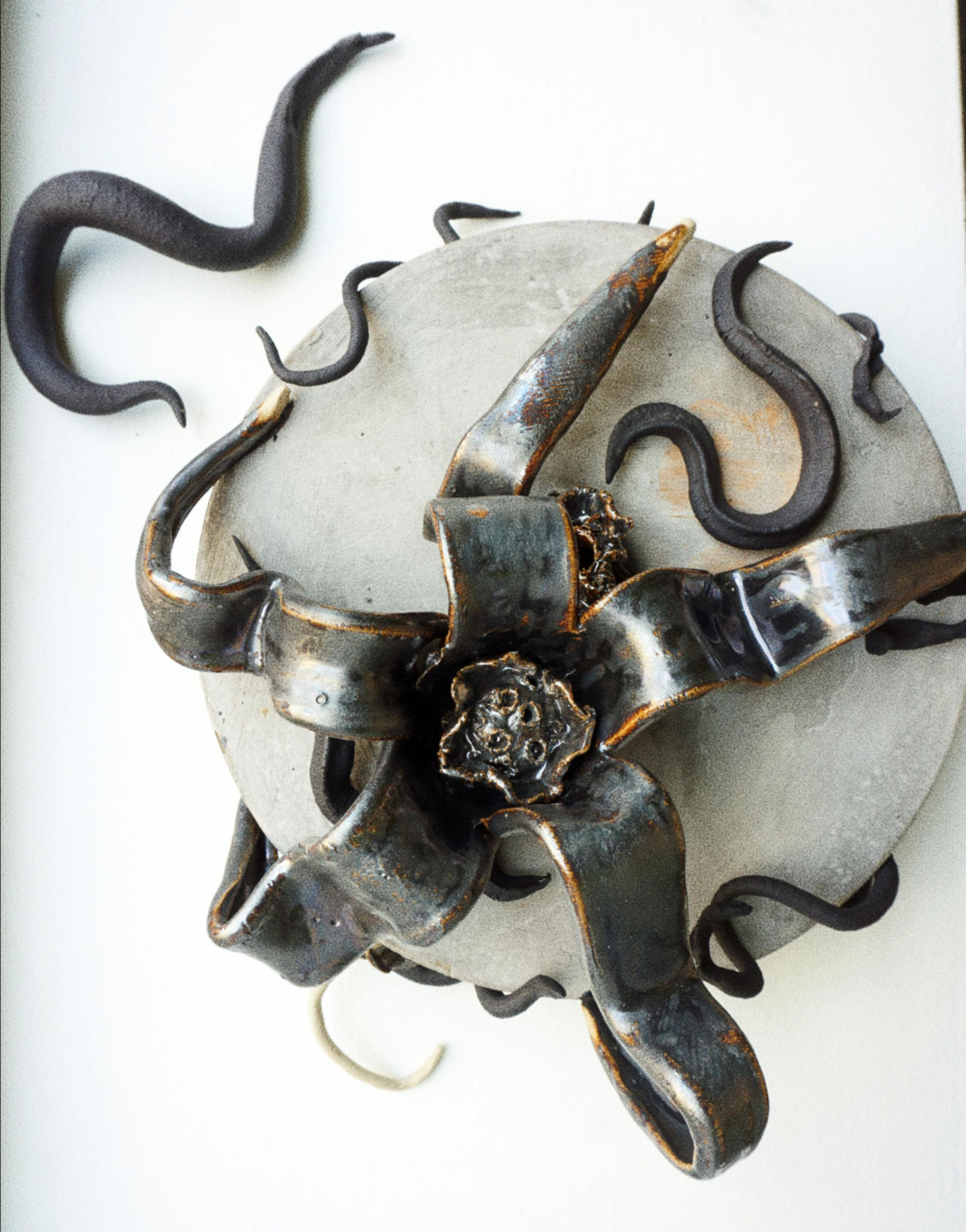 The workshop is part of the ARCADIA project, focusing on the wilderness and living in harmony with nature. In the exhibition, Aline’s ceramic creatures crawl up the walls or lie on the floor, spreading out their tentacles.