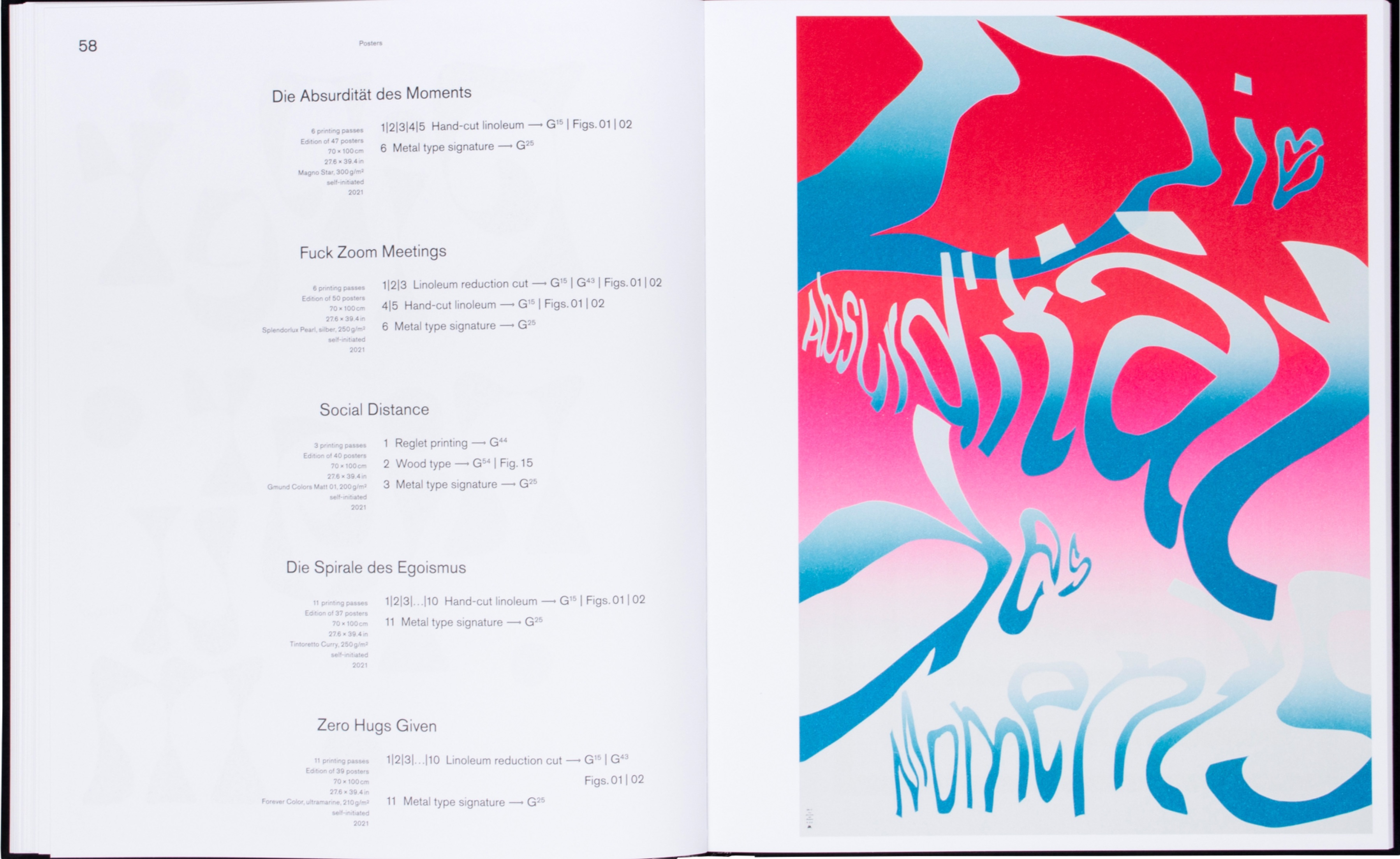 The publication includes the thoughtful presentation of 60 selected posters. And also features black and white photographs by Peter Hauser. These photographs illustrate the artist’s interconnected digital and analogue working process.