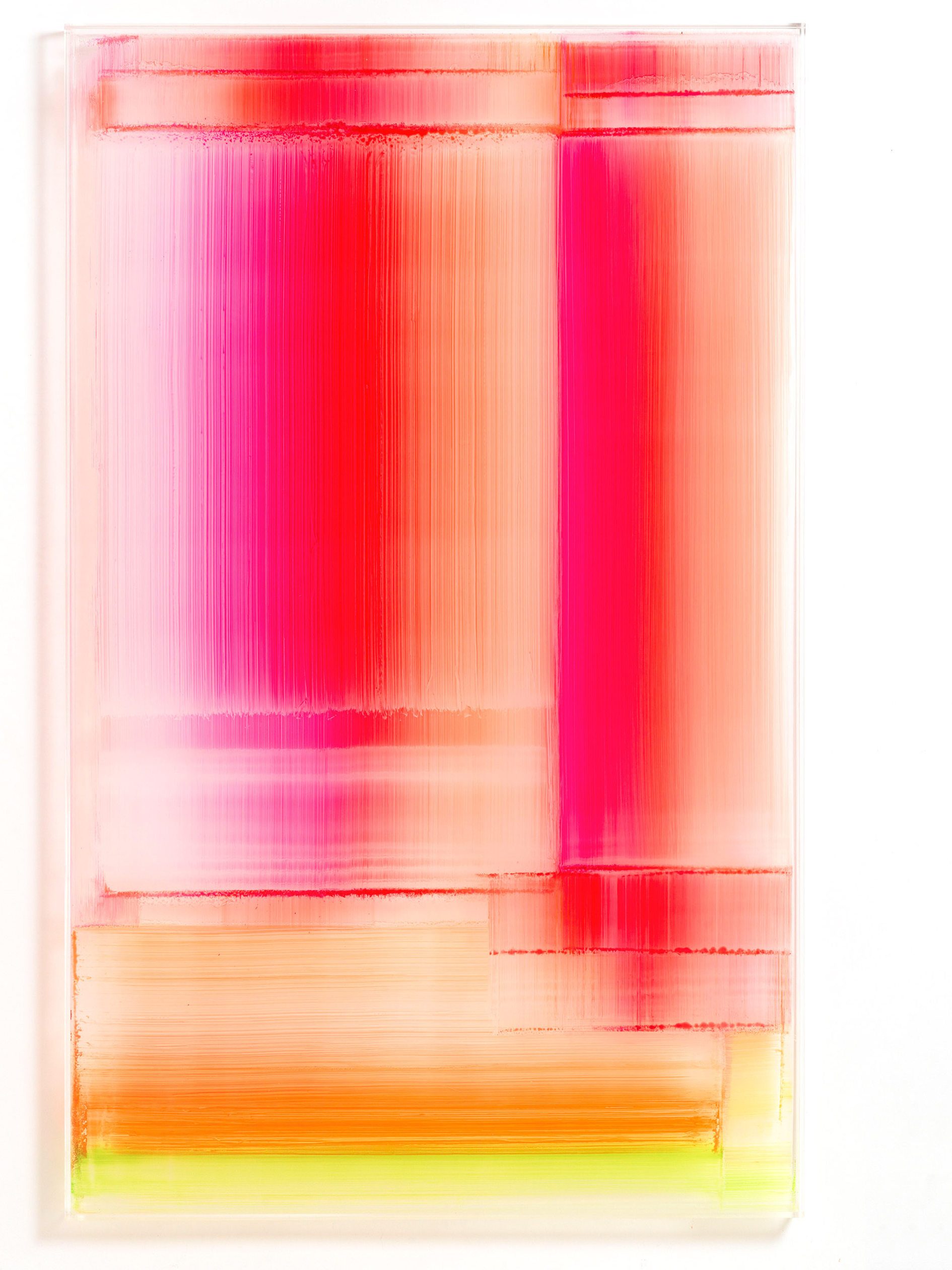 “Nicola Staeglichs Aufmerksamkeit gilt der Farbe als Materie ebenso, wie der Farbe als Lichterscheinung. Breite Pinselbahnen verdichten sich in Staeglichs Bildern zu geschlossenen, sowie transparenten oder halb-transparenten Farbflächen, definieren Oberfläche und Raum. Das von ihr gewählte Trägermaterial, flache Plexiglaskästen, oder durchscheinende Folien die neben und übereinander gehängt sind, reflektieren das vorhandene Licht. So entsteht zwischen gemalter Oberfläche und Grund ein leuchtender Raum im Raum, der die Farbe zum Schweben bringt. ”