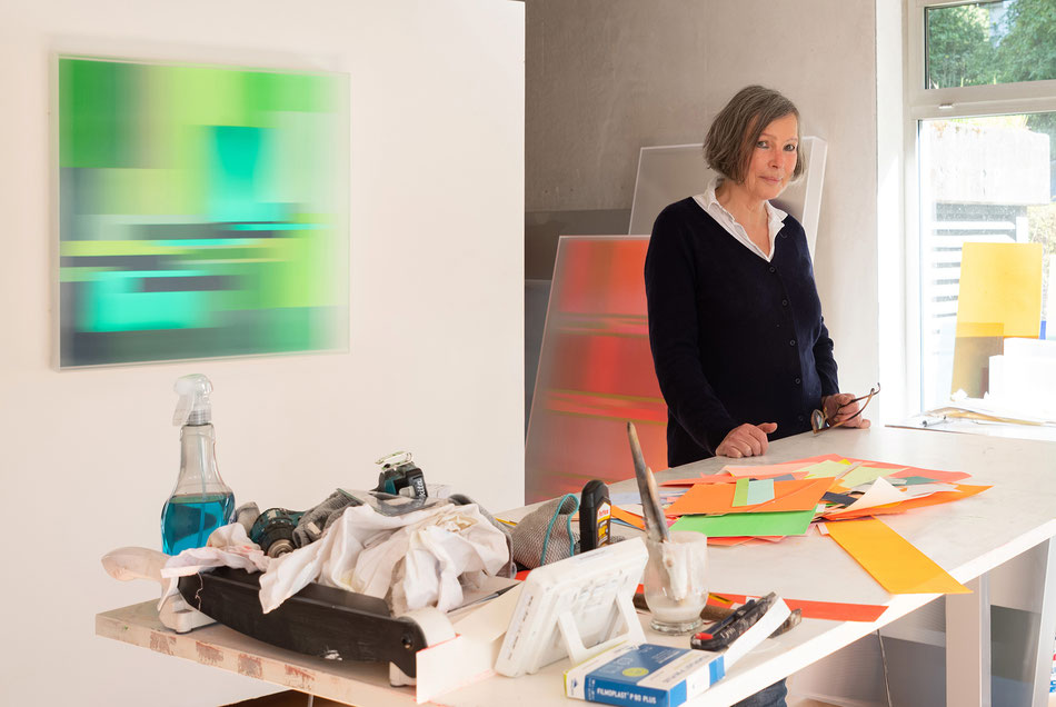 Since the mid-1980s, Christiane Grimm has been creating color and light spaces, focusing her research on the luminosity of color, its nuances, combinations, and effects on viewers. A trained architect and self-taught artist, Grimm creates visual objects, architectural light sculptures, and boxes that explore how color perception is influenced by lighting and material.