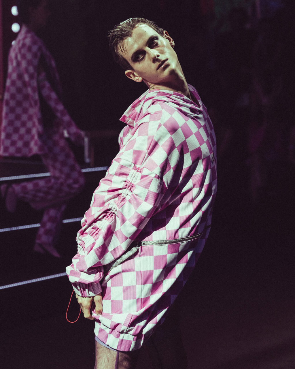The night began with stillness—then breath, then movement. Models emerged from the shadows, stepping into the club’s neon haze. Precision tailoring met provocative cut-outs, each curve of fabric revealing just enough to tease, to suggest. Pink-and-white jacquard wove a story of vulnerability, of innocence redefined.