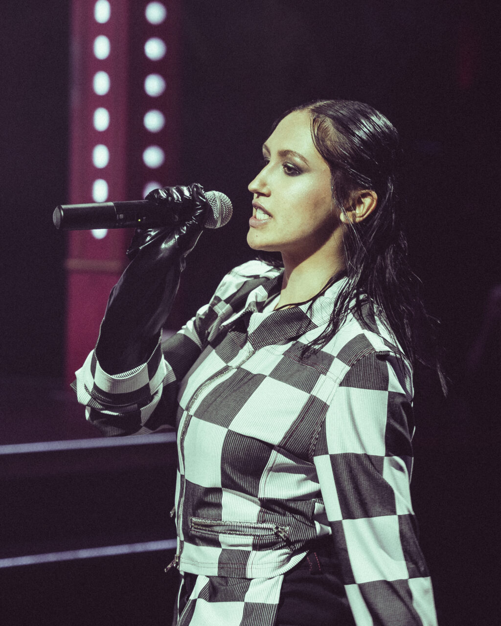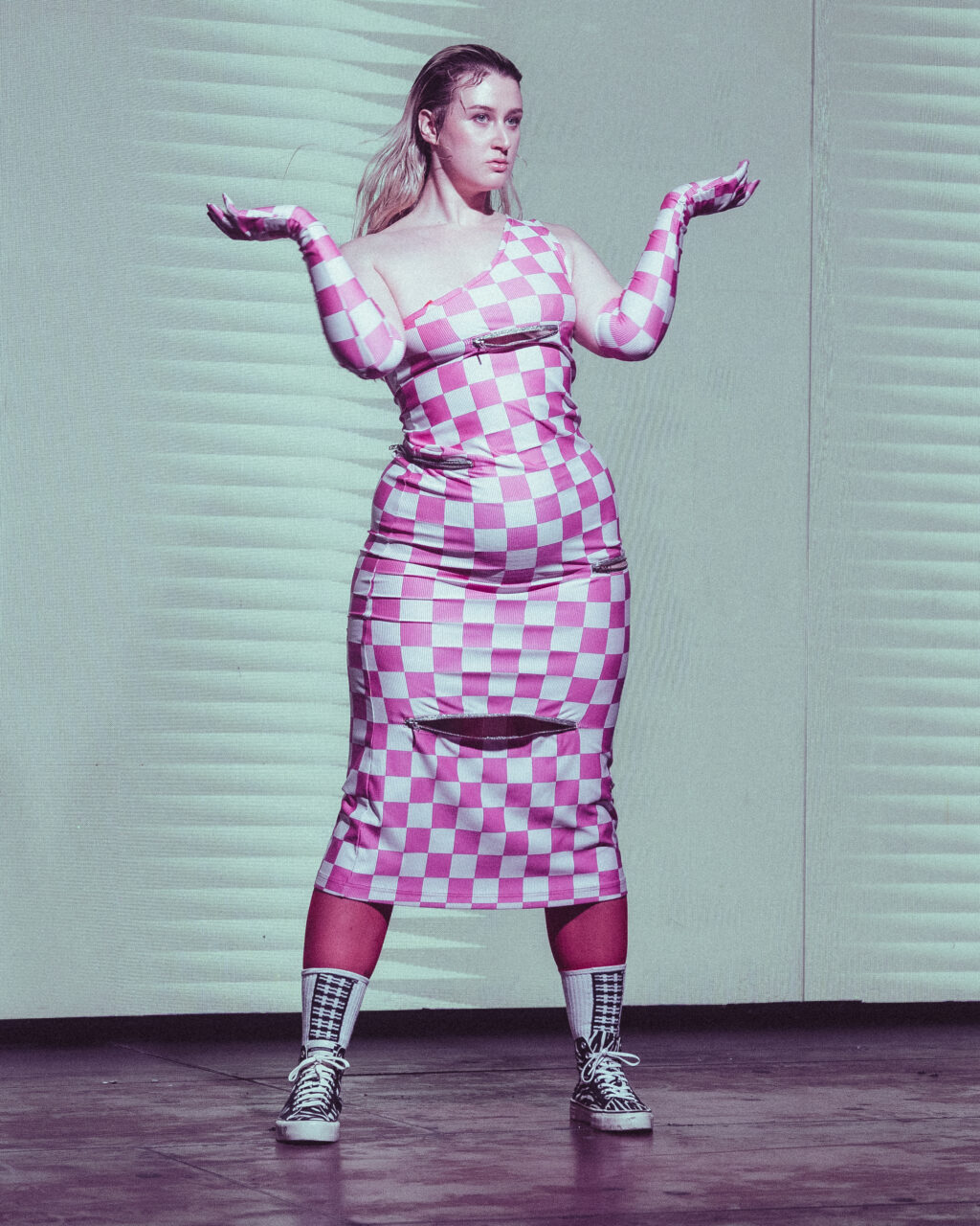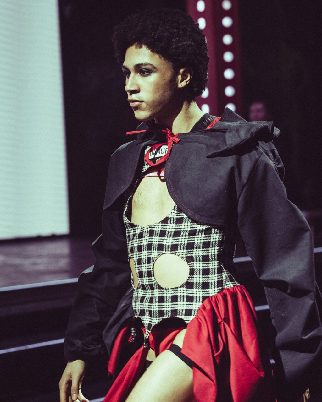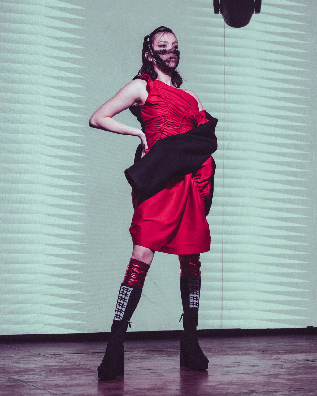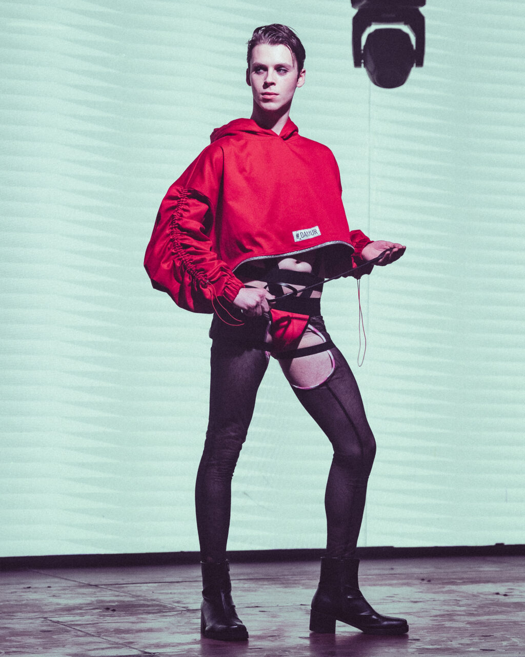 Then, the tempo shifted. The first live performance ignited the space—Zazania (@zazania.57) (Berlin-based singer) ’s ‘In Da Club’ pumped through the venue like a heartbeat on fire. As the beat dropped, the silhouettes grew bolder, oversized hoodies cocooning the body like armour, fetish-inspired blazers slashed open with neoprene contrasts. Deep reds and blacks collided in a visual war between restriction and release.