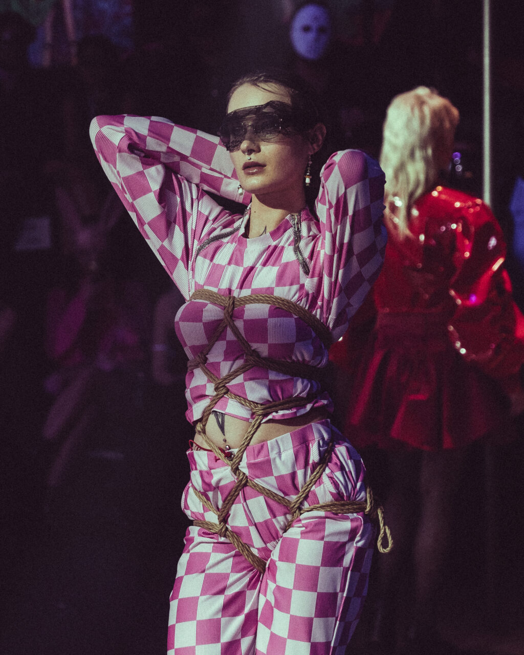 The music dropped, and the air thickened with anticipation. The room darkened, the tension tangible. Then, Asimira (@asimira.rope) (Berlin-based bondage artist) took the stage, commanding attention with a BDSM bondage performance that blurred the boundaries between fashion, art, and raw human desire. Ropes entwined, bodies restrained and released in a hypnotic dance of control and surrender.