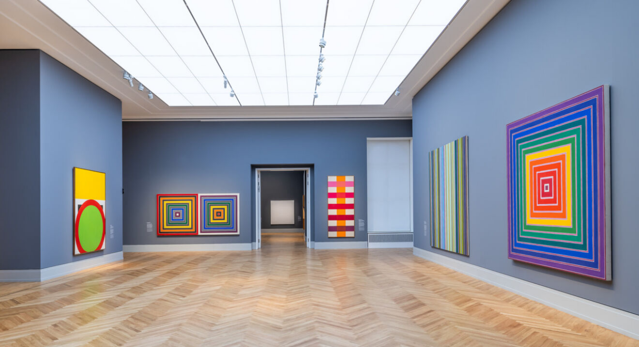 Vertreten sind unter anderem Josef Albers, Sonia Delaunay, Barbara Hepworth, El Lissitzky, Agnes Martin, Piet Mondrian, Bridget Riley, Frank Stella und Victor Vasarely. Leihgaben der Schau stammen aus der Courtauld Gallery, London, der Fondation Beyeler, Riehen/Basel, dem Louisiana Museum of Modern Art, Humlebæek, der Fondation Gandur pour l’Art, Genf, sowie der Peggy Guggenheim Collection, Venedig. Ebenfalls präsentiert werden Werke aus bedeutenden US-Sammlungen wie dem Whitney Museum of American Art und dem Solomon R. Guggenheim Museum in New York sowie der National Gallery of Art in Washington.![]()
