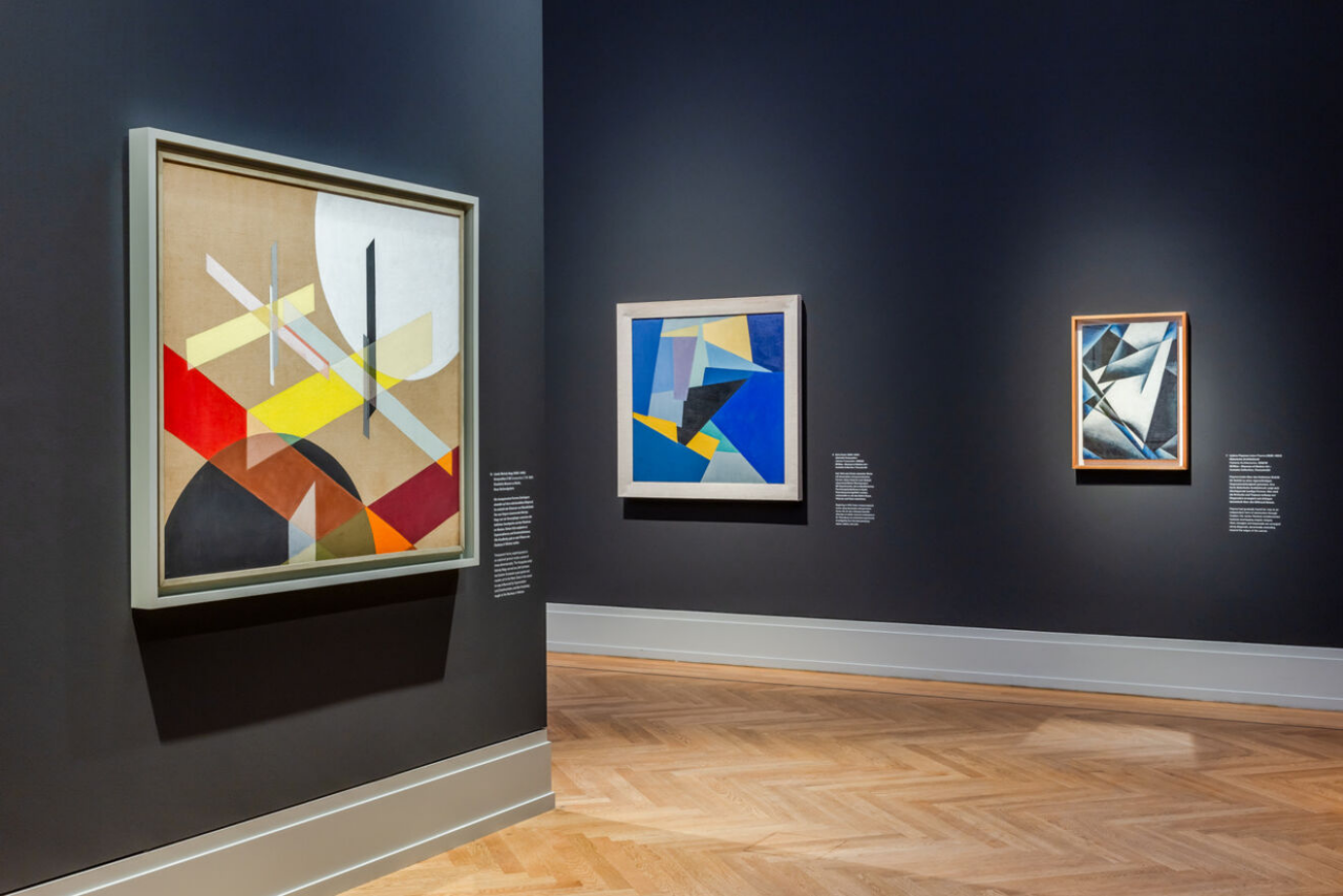 Radikal modern, entstanden in Europa und den USA vielfältige Strömungen, die als Geometrische Abstraktion die Grenzen der Malerei ausloteten: Von Suprematismus und Konstruktivismus über das Bauhaus und die britische Nachkriegsabstraktion bis hin zu Hard Edge und Optical Art. Kosmos Kandinsky. Geometrische Abstraktion im 20. Jahrhundert erzählt als erste Ausstellung in Europa die geometrisch-abstrakte Geschichte nicht in Episoden nationaler Bewegungen, sondern macht Verbindungslinien zwischen ihnen deutlich.