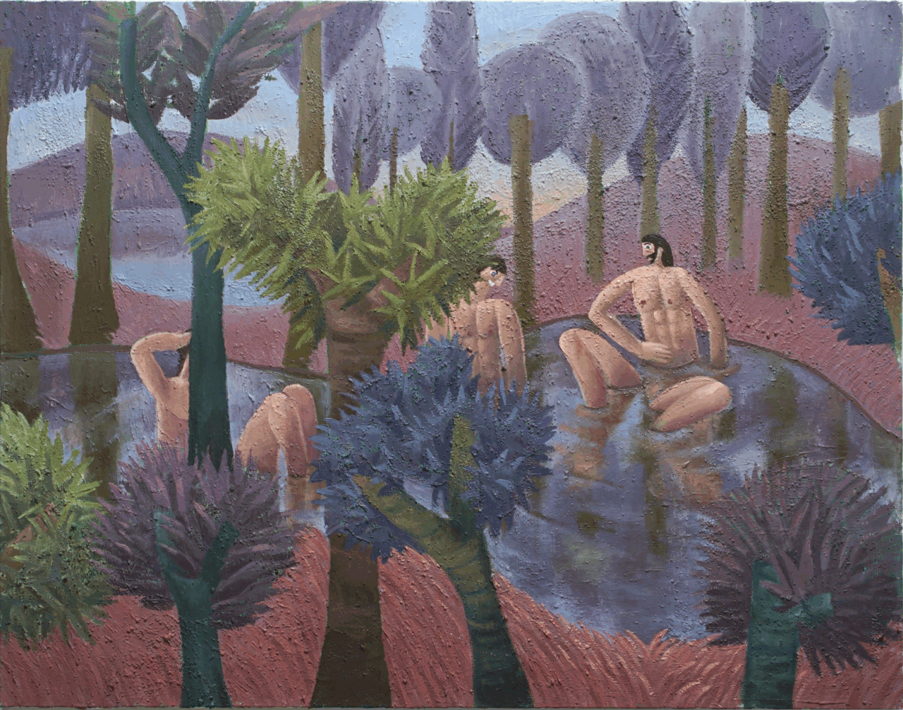 The rough texture of chalk paint lends the works a raw, almost primal quality, while depictions of water and impressions of softness in the leaves of the trees and grass evoke a strong sensuality the softness of leaves and grass evoke a visceral sensuality – a language both universal and deeply rooted in the body.
