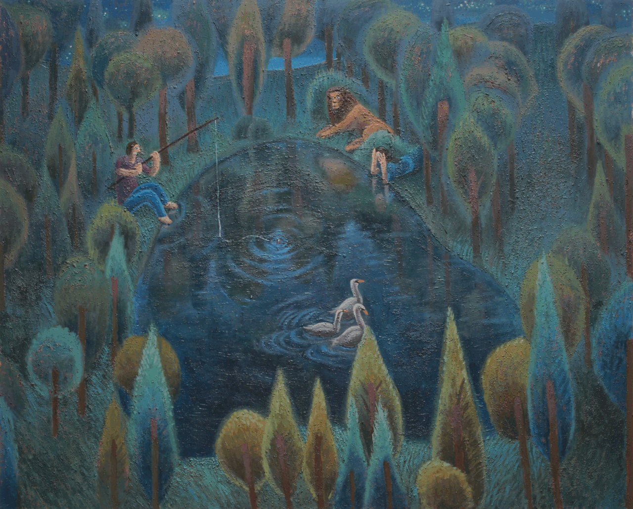 On the surface, these are all scenes of repose, but an undercurrent of tensions lingers. Take, for instance, the painting in which two figures sit on the banks of a river, playing the guitar. Around them, the world seems to pause, expectant: a tiger rests further down the river, its mouth slightly ajar; birds sit motionless in the trees; the sun burns a deep red. Elsewhere, a snake coils around the trunk and branches of a tree, poised to strike while in another work it is a swan that becomes the uncanny presence, emerging from behind a tree in the foreground while in the distance, figures bathe in the bend of a glassy river.
