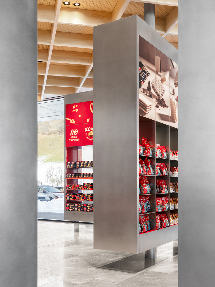To mark 100 years of its iconic hazelnut wafer, Loacker entrusts MoDusArchitects with the complete transformation of its flagship store in Heinfels, Austria. More than just a retail store, this space embodies the beating heart of the brand: a meeting point between company and consumer, welcoming a large number of people from all over the world particularly in the summer, where it reaches more than 3,500 visitors each day.