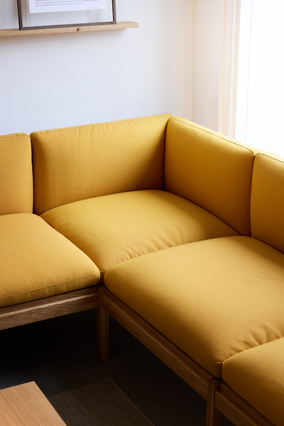 Vier Grundelemente können flexibel kombiniert werden, so dass eine Vielzahl unterschiedlicher Sitzmöbel angeboten wird – von Sesseln und Daybeds über Zweisitzer bis hin zu größeren Sofakonfigurationen mit integrierten Tischen. Das Modular Sofa zeichnet sich durch eine hohe Umweltverträglichkeit aus. Der Rahmen Gestell ist aus FSC-zertifiziertem Eichenholz gefertigt, sowohl der Schaumstoff als auch der Bezug der Polster tragen das EU-Ecolabel. Modular Sofa ist in zwei Stoffvarianten des dänischen Stoffspezialisten Kvadrat in insgesamt sechzehn Farben erhältlich.