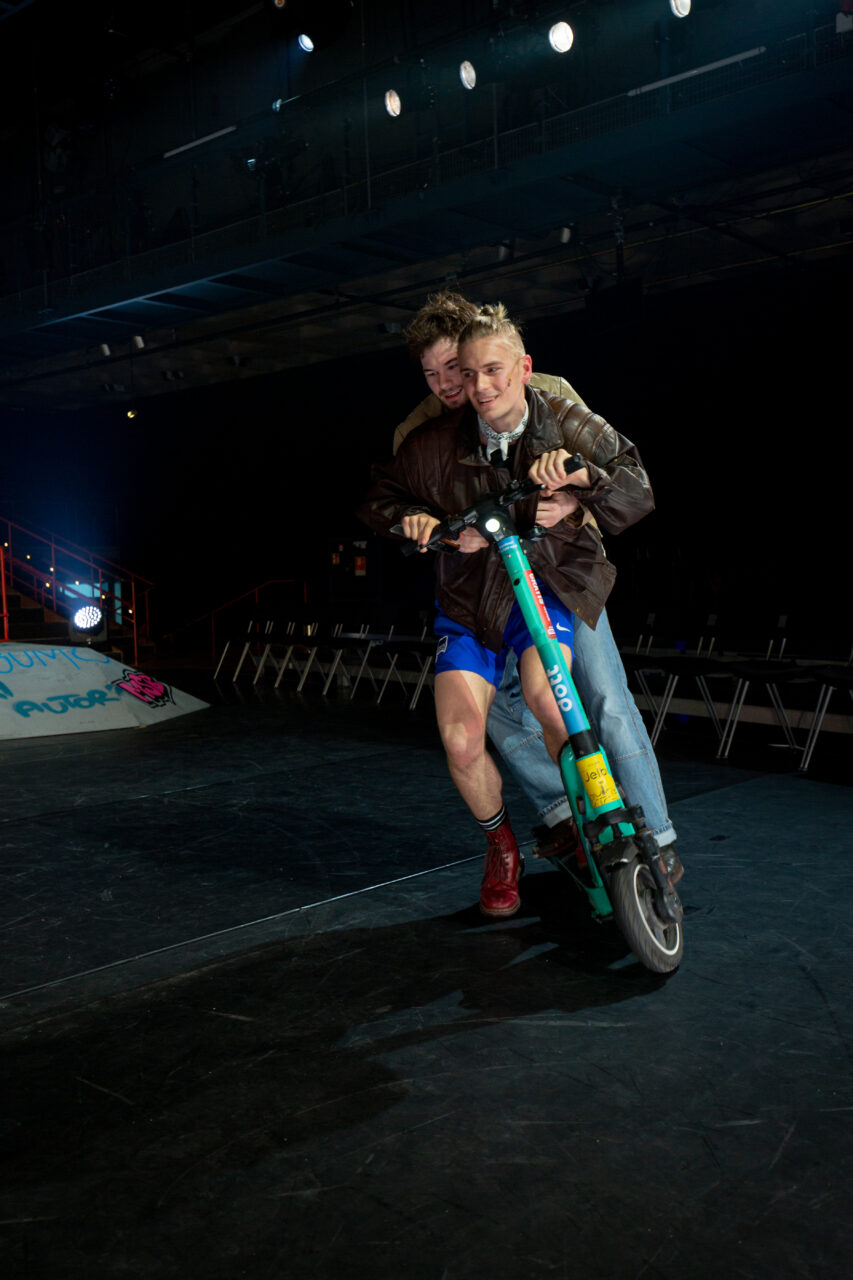 Für die Choreografie zeichnet erstmals die neu als Professorin an die Universität der Künste Berlin berufene Tänzerin und Choreografin Melissa King verantwortlich. In einem variantenreichen Mix bedient sie sich der unterschiedlichsten Stile von Musical Jazz bis Tanztheater und lässt die Darsteller*innen mit Hula Hoops über die Bühne wirbeln. Der Bühnenraum mit Bushaltestelle und Tischtennisplatte breitet sich bis auf die Zuschauer*innentribüne aus und das Publikum kommt den Darsteller*innen ganz nah.