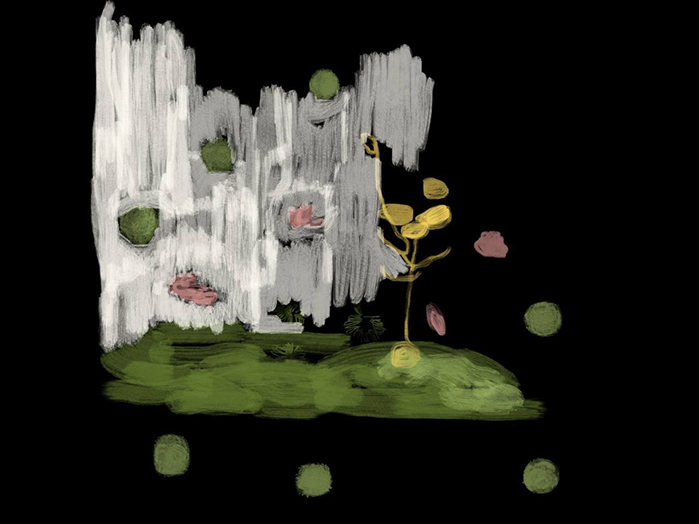 Nature is a recurring theme in Aylar Dastgiri’s (b. 1988 Tehran) work, in which she also navigates between three-dimensional and two-dimensional spaces. The exhibition presents a series of Dastgiri’s digital paintings where objects and environments are depicted through bright, painterly strokes set against entrancing matte-black backgrounds.