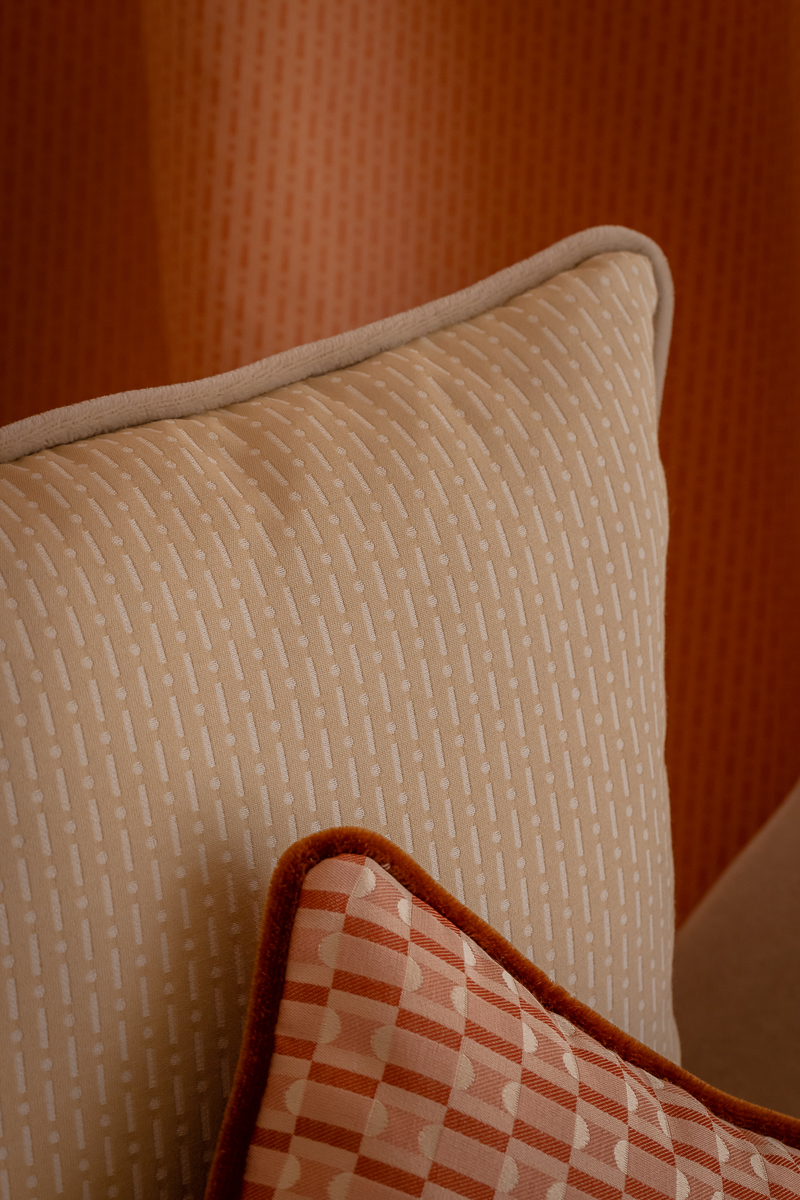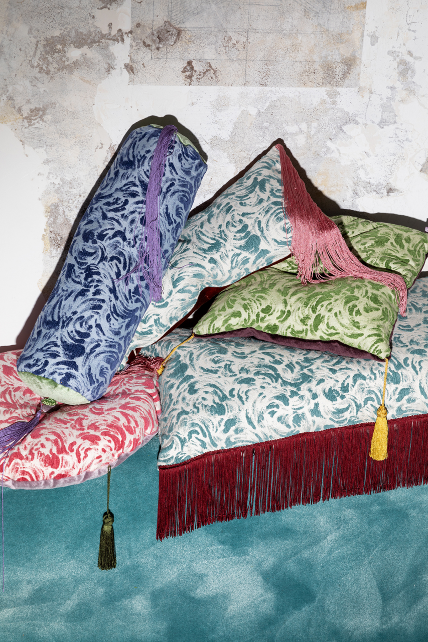 The High Tide pattern, developed by designer Daniela Pinotti in collaboration with STUDIOTAMAT, is a jacquard fabric also created using the lampasso technique. It uses multicolored yarns to form intricate decorations and detailed designs against a minimalist background, reflecting Daniela Pinotti’s creative world and translating her vision into tangible patterns that capture fluid forms inspired by the ocean waves.