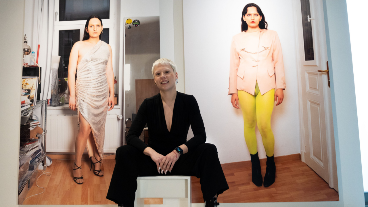neo zwischen den fast lebensgroßen Porträts von Genesis Kahveci, im freien Bezug auf die Körperinszenierungen von Eberhardt Brucks. (Foto: Yasmin Künze)