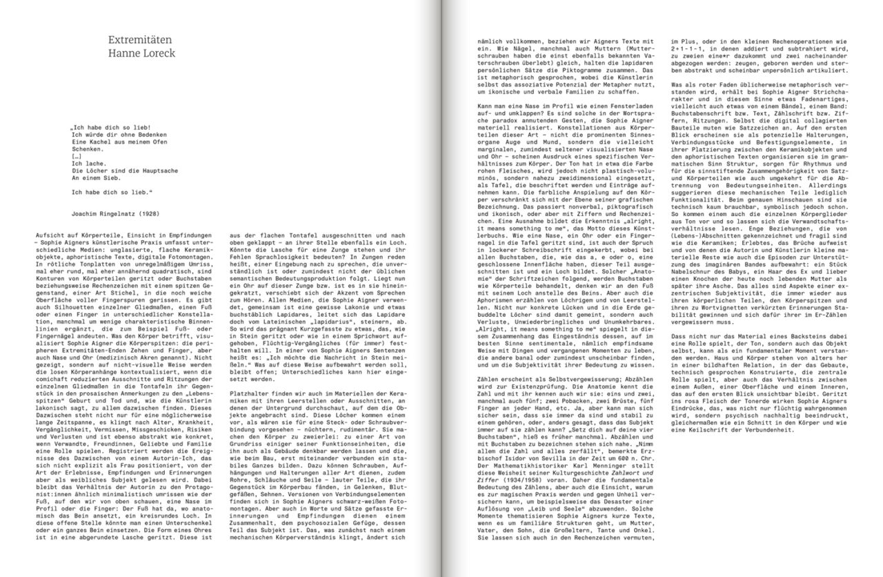 „I want to carve the message in stone“ – eine Aussage, die an den Wunsch erinnert, Vergängliches festzuhalten. Doch welche Botschaft gemeint ist, bleibt offen: Sind es Konturen von Körperteilen, eingeritzt in roten Ton? Oder einfache Rechenaufgaben wie 2+1-1-1? Sophie Aigner widmet sich in ihrer Publikation der Idee von Leerstellen und Verlusten – von konkret in die Erde gegrabenen Löchern bis hin zu unwiederbringlichen Momenten des Lebens.