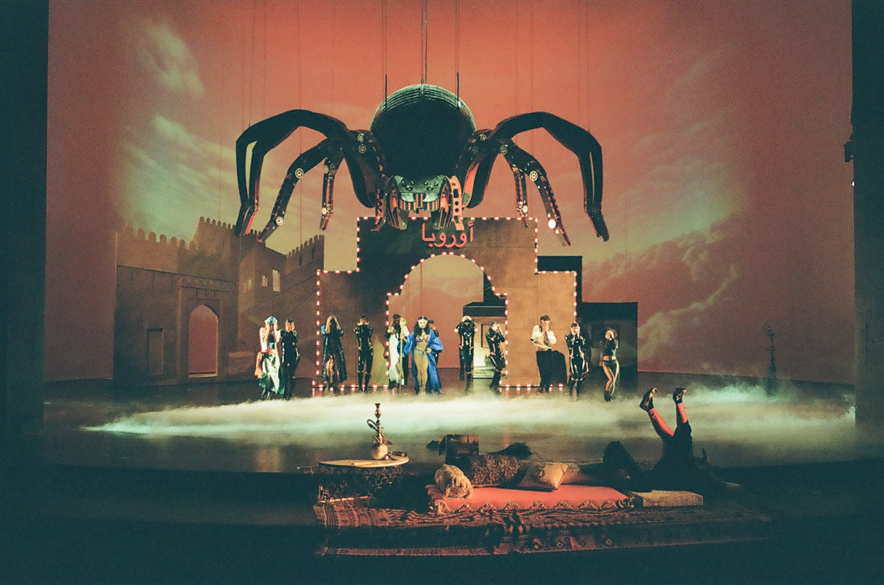 Kurdwin Ayubs Weiße Witwe spielt am 22. März, mit der Neuköllner Rapperin addeN, Samirah Breuer, Benny Claessens, Georg Friedrich, Zarah Kofler und dem Tanzchor SC motion*s im Bühnen- und Kostümbild von Nina von Mechow.